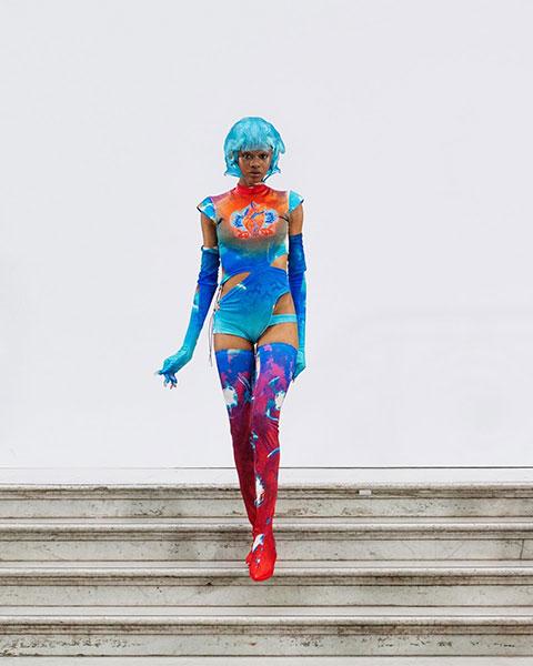 The collection rejects conventional seasonal structures and operates at the interface between performance costume and contemporary fashion. Each piece carries distinct character traits balancing theatrical elements with wearable design. With this approach, Lei creates a new fashion language that speaks to both current environmental concerns and future human possibilities.